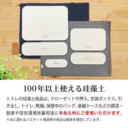 品 名 トスレ珪藻土マット 10シリーズ レギュラー 数 量 1枚 素 材 北海道稚内産 珪藻土、水酸化カルシウム(消石灰)、繊維 サイズ 約290×220×10mm 色 サンドベージュ(原料由来、無着色) 用 途 ・食器の水切りかごやまな板立ての水切りとして ・コップやカトラリーの水切り活用、収納 ・洗面トレー、コップ置きに ・下駄箱・靴内の湿気とり、楽器の保管 ・釣り道具やスポーツ道具、ゴルフバックなどの湿気や臭いを吸着 ・衣装ボックスの湿気吸収と臭いの吸着 表裏両面使用 可 生産国 日本 取り扱いについて 直接水に触れず引き出しの中や衣装ケース、冷蔵庫、靴箱などの消臭、調湿としての目的・用途であれば効果は100年以上持続します。