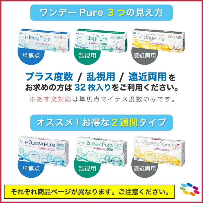 また、「ワンタッチクローズ機構」を採用したパッケージは、簡単に開けられ、指先1本で“カチッ”と閉められて衛生的 ピュア シリーズ:近視用 / 遠視用(32箱のみで対応) / 乱視用 / 遠近両用 をお取り扱いしております。