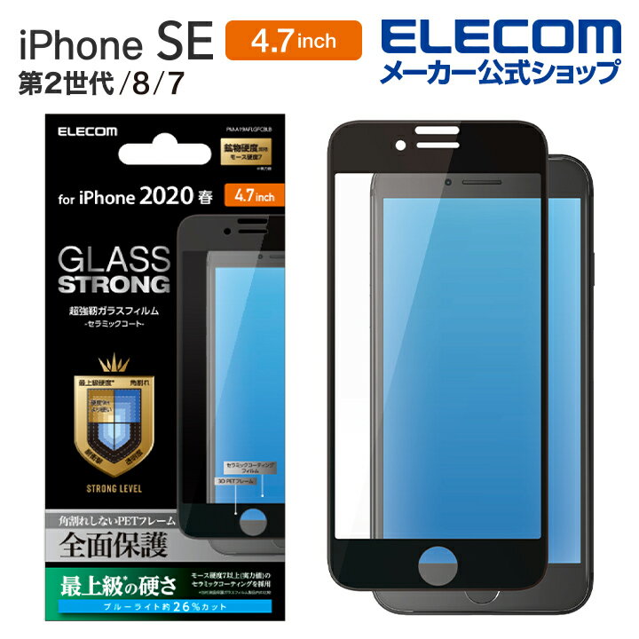 ■対応機種:iPhone SE 第2世代、iPhone 8、iPhone 7、iPhone 6s、iPhone 6■セット内容:ラウンド対応ガラスフィルム(セラミックコートガラス、ブルーライトカット仕様)×1、ホコリ取りシール×1、クリーニングクロス×1■材質:接着面:アクリル系粘着、外側:ガラス、PET■カラー:ブラックエレコムダイレクトショップ鉛筆硬度9Hより高硬度なモース硬度(鉱物硬度規格)7以上のセラミックコートを採用。